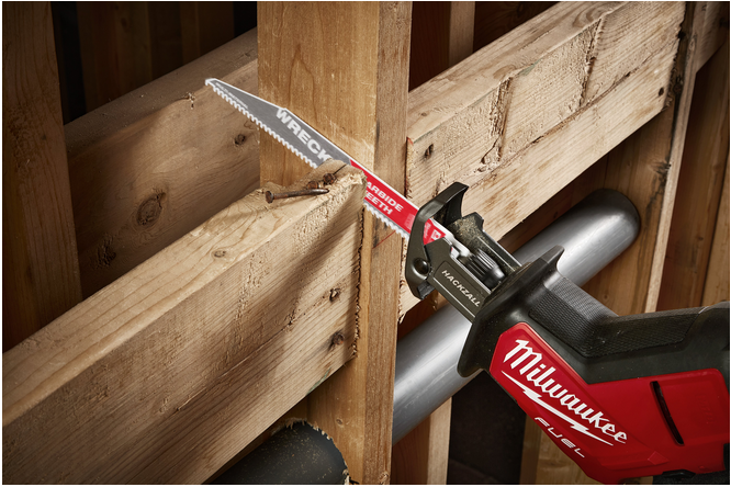 - Brzeszczot z zębami z węglika spiekanego WRECKER™ do cięcia w różnych materiałach umożliwia cięcie grubego metalu, żeliwa, drewna z gwoździami, hartowanych śrub i elementów złącznych.